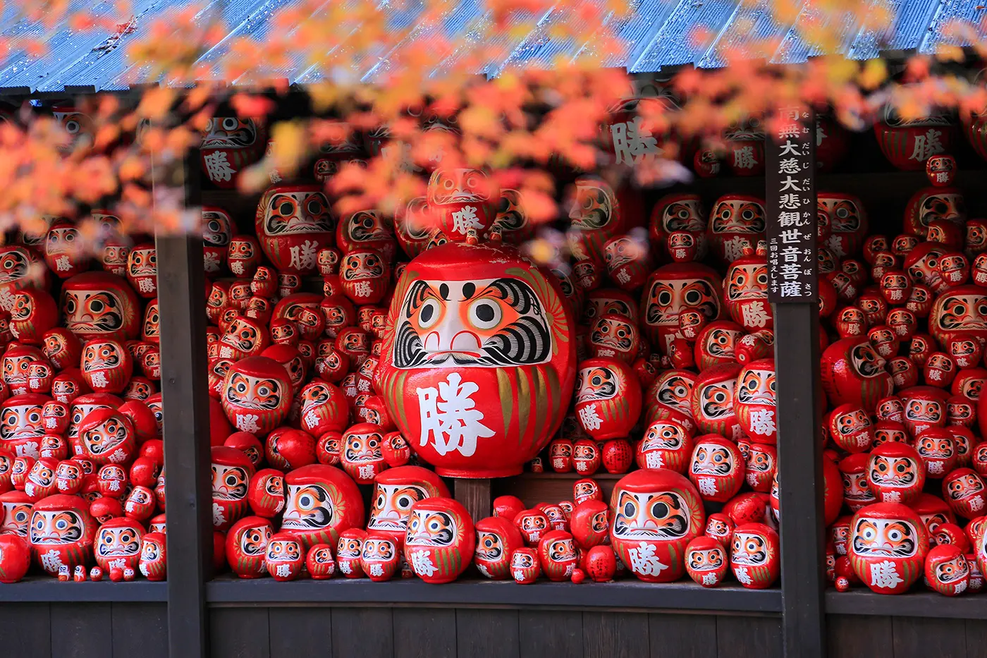 来胜尾寺祈求好运吧!参观期间,您可以欣赏到供奉的达摩不倒翁和梦幻般的秋季红叶灯光秀。