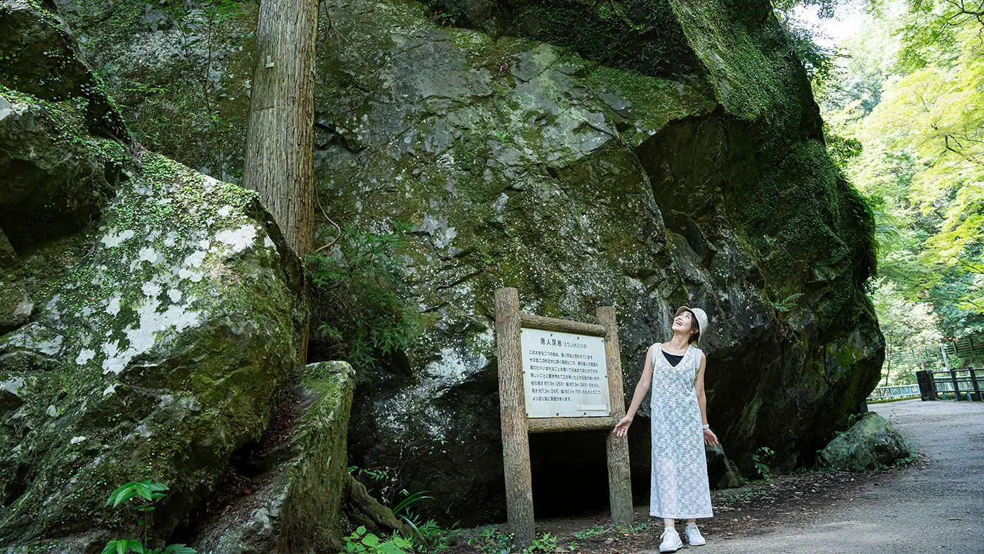 途中、巨大な岩を見つけて歓声をあげるレイチェルさん。「唐人戻岩」と呼ばれるこの岩には、その昔、唐の貴人が「箕面大滝」を見るためこの岩まで来たものの、山道の険しさに恐れをなして引き返したという逸話があり、そこから名付けられたとされています。