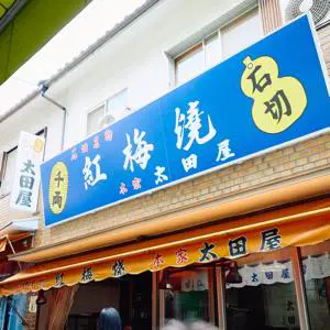 首先買到的是在商店街格外引人註目的“紅梅燒太田屋”的仙貝。葫蘆形的煎餅上刻著大大的“石切”的文字。