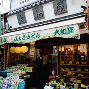 接下來,在石切的午餐推薦石切名產“大和屋”的艾草烏冬面。據說因為來石切神社的人中有很多人生病了,所以比年糕更容易吃,所以就提供烏冬面了。是三代持續創業70年左右的老字型大小,店主擔任石切參道商業街振興組合的理事長。
